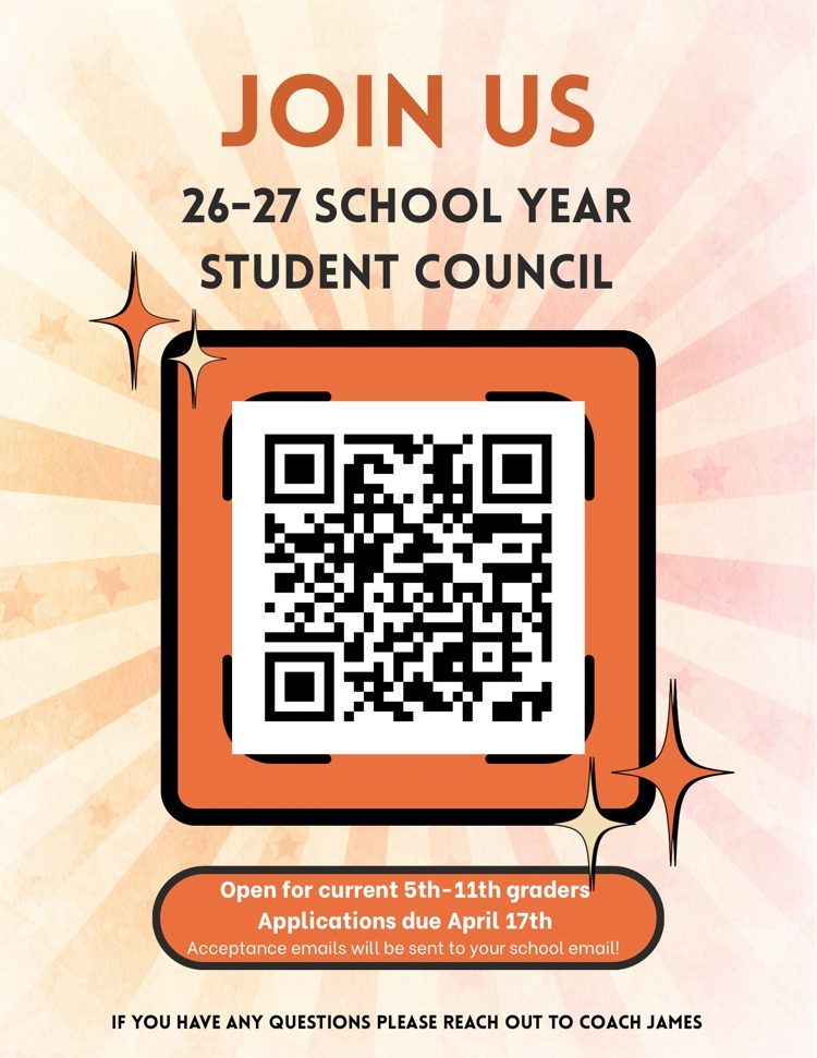Student Council applications for the school year 2026-2027 are now OPEN! This is for students currently in 5th-11th grade. Applications are open until the 17th. Students need to fill the application out through their school email. If you have any questions please reach out to Coach James.