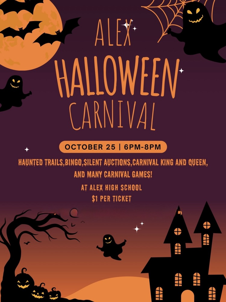 Join us TONIGHT at our Halloween Carnival at the Alex High School from 6-8! Bingo, Games, Silent Auction, King & Queen, Book Fair, etc! Tickets will be $1!