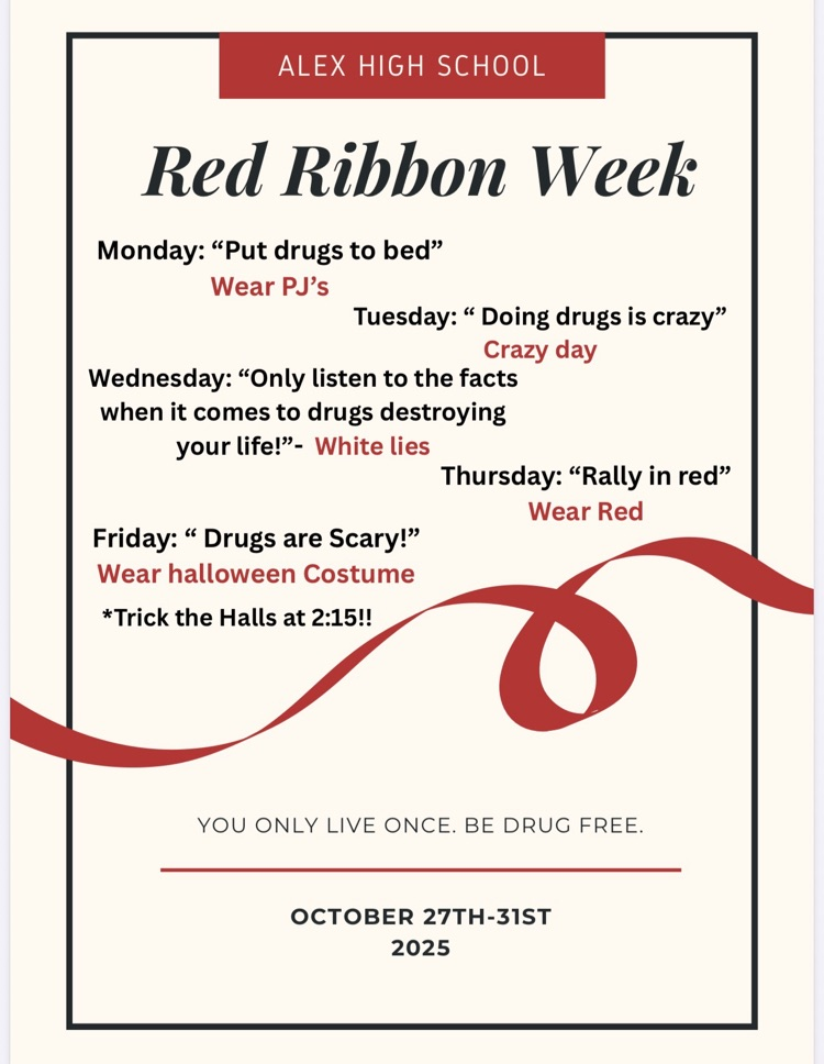 Reminder that this week is Red Ribbon Week & “Trick the Halls” at Alex Schools!