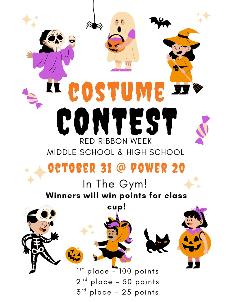 Friday at Power 20, Middle School and High School students will have a chance to win class cup points for their grade by entering the Costume Contest!