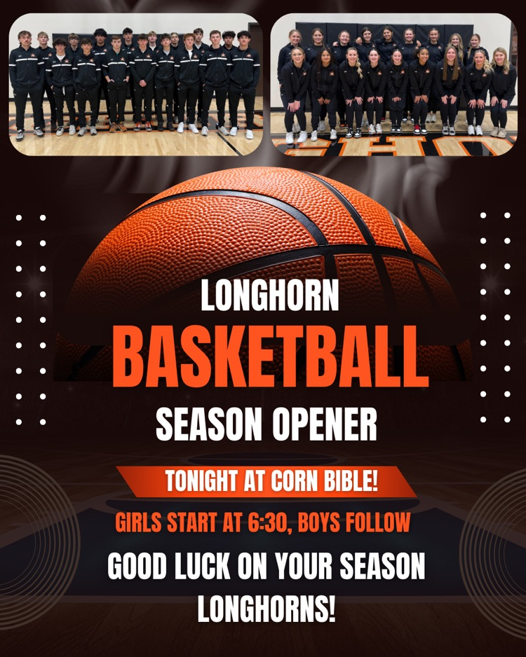Longhorn Basketball is BACK! Season opener TONIGHT at Corn Bible! Good luck on your season this year Longhorns!