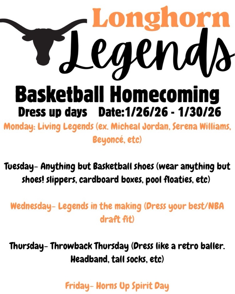 Basketball Homecoming Week is January 26th-30th 🏀‼️ Theme: Longhorn Legends! The dress up days and details about the poster contest are posted below.