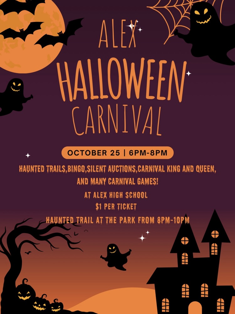 Join us at our Halloween Carnival on October 25th from 6-8pm at the High School and then the STUCO Haunted Trail afterwards from 8-10pm at the Alex Park! 👻🎃